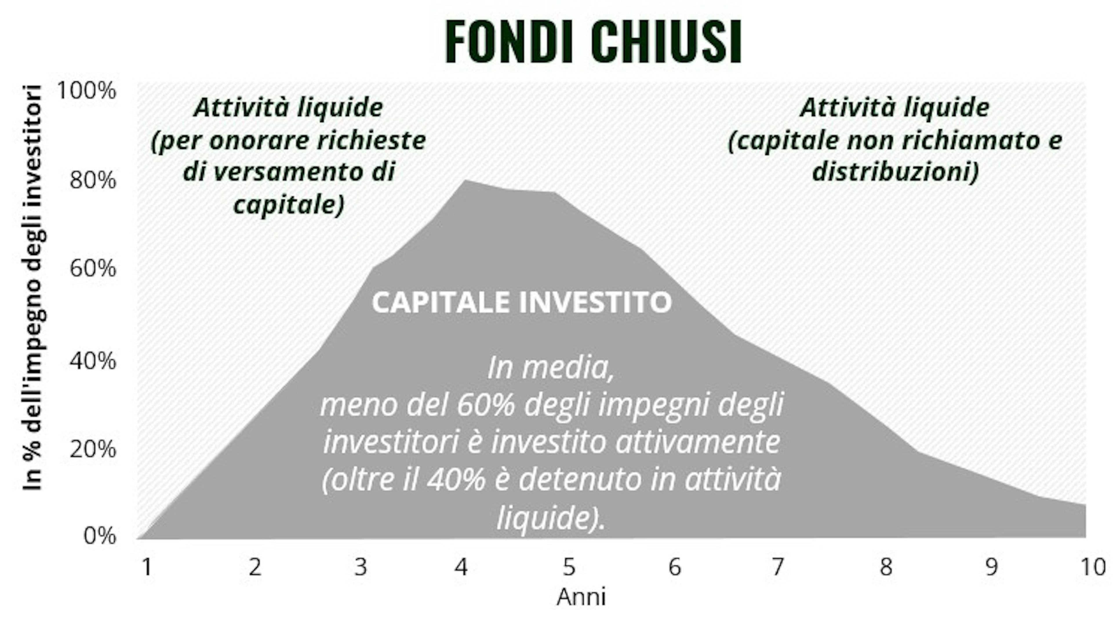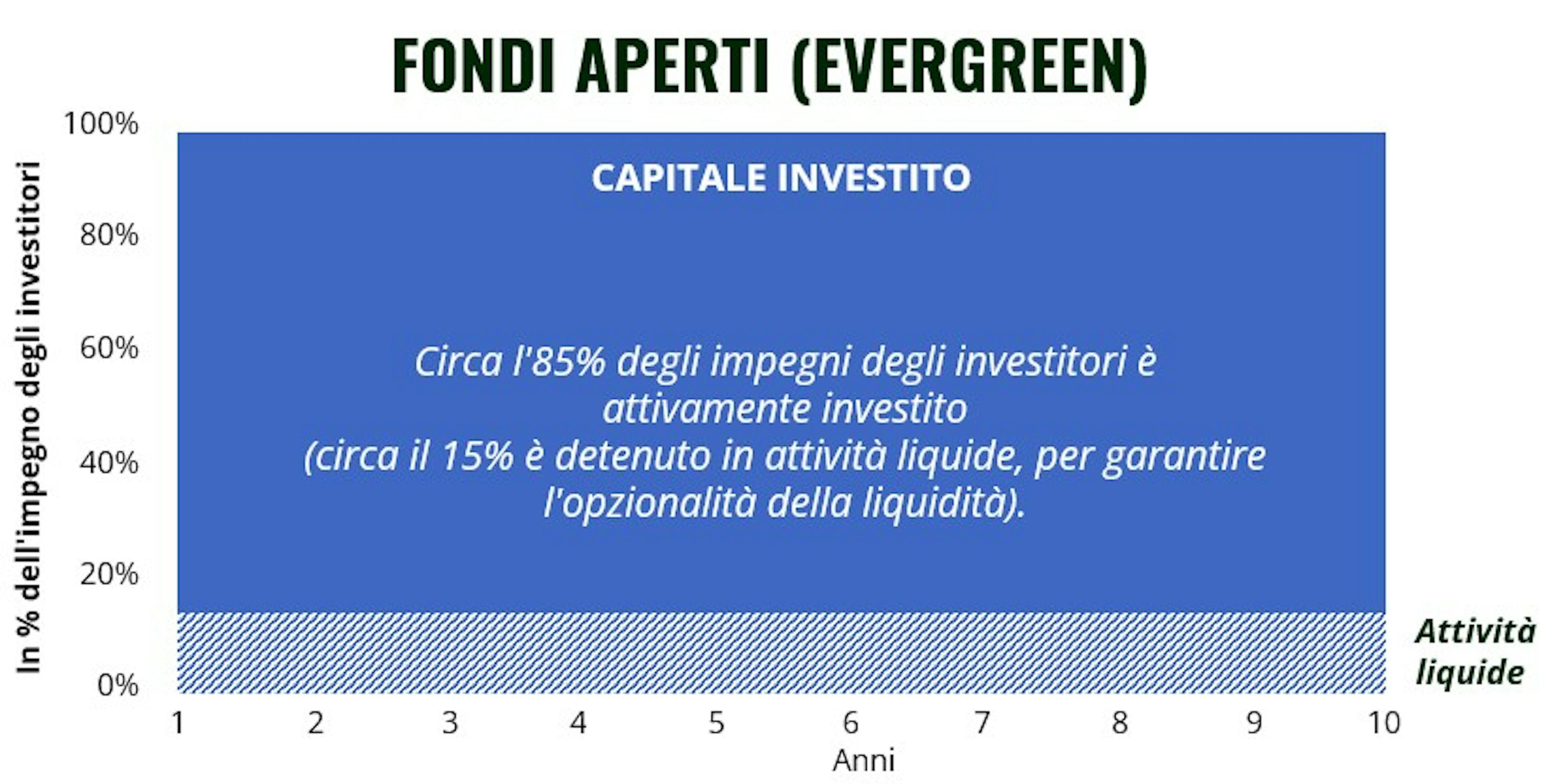 È importante notare che i fondi chiusi utilizzano tipicamente il tasso di rendimento interno (IRR), che tiene conto solo dei rendimenti sull'importo effettivamente investito, rappresentato nel grafico a sinistra. Questo importo investito rappresenta spesso una frazione del capitale totale impegnato, con una media del 60% circa nel corso della vita del fondo. Gli impegni non ancora investiti rimangono come liquidità detenuta dall'investitore e saranno soggetti a un rendimento diverso, a seconda delle capacità di gestione della liquidità e dell'esperienza dell'investitore. I fondi evergreen, invece, utilizzano la metrica del rendimento annuale, calcolato sulla base dell'importo totale richiamato dal primo giorno, rappresentato nel grafico a destra.