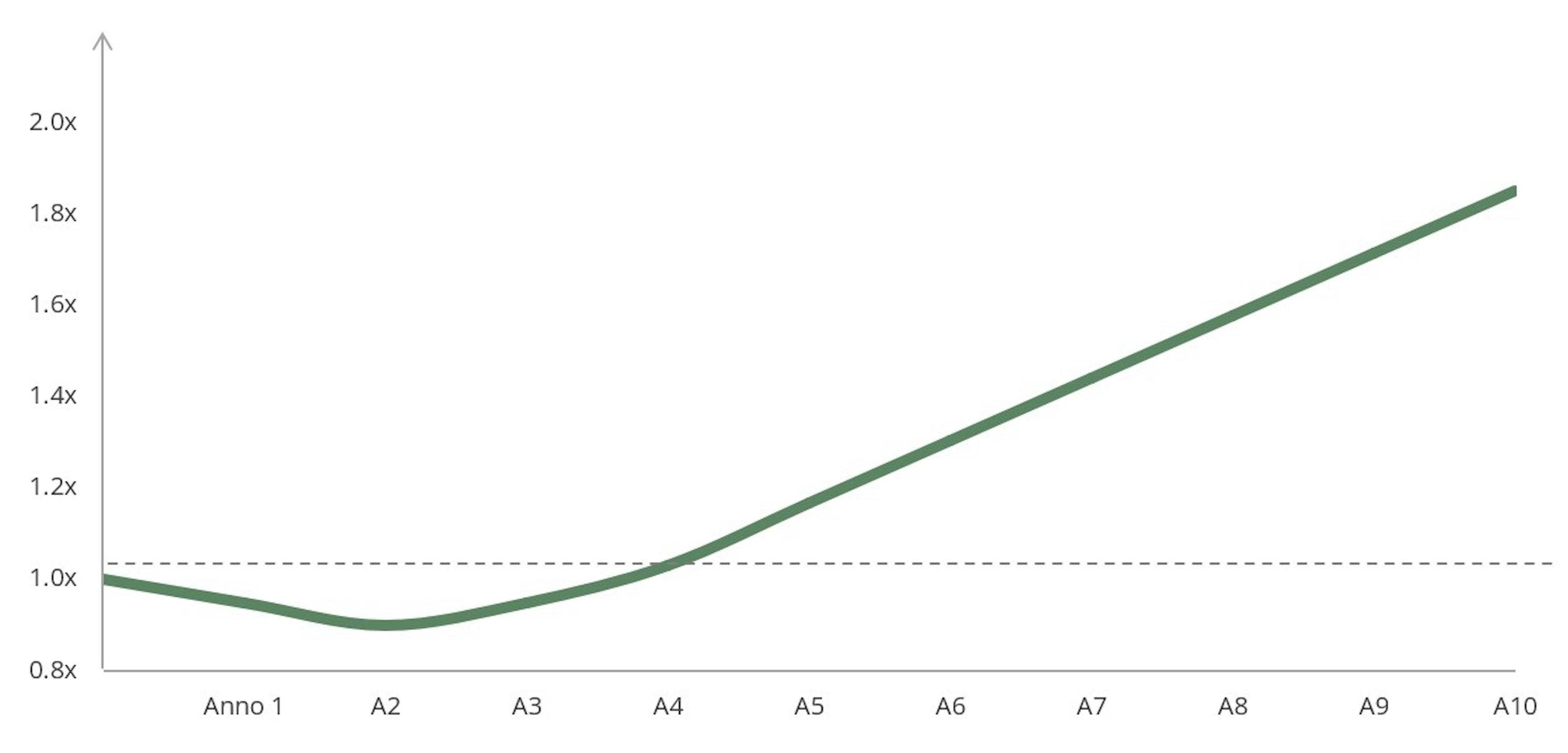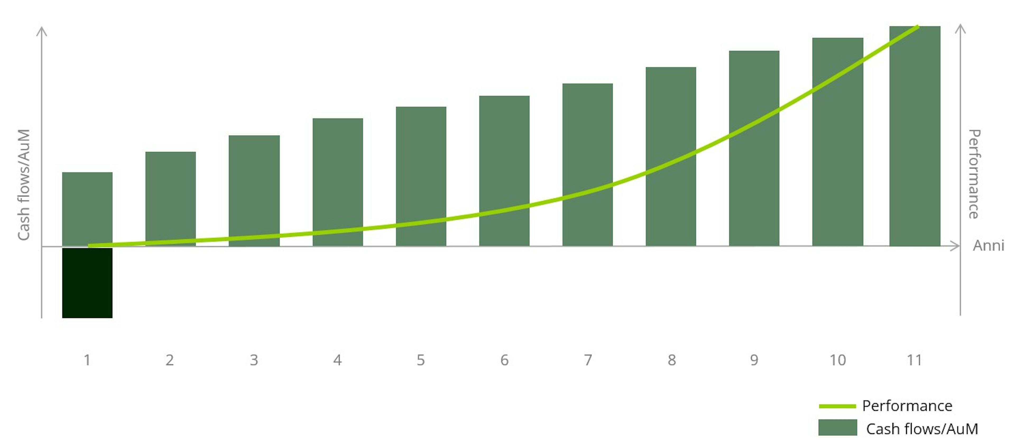 Con un fondo evergreen, il 100% del capitale viene richiamato fin dal primo giorno: gli investitori sono immediatamente esposti a un portafoglio di società private e possono beneficiare dell'apprezzamento degli investimenti già effettuati nel fondo. In questo modo si attenua l'effetto "J-curve" che si riscontra nei fondi chiusi. Se gli investimenti esistenti dovessero rivalutarsi, è possibile ottenere un rendimento positivo anche entro un mese dall'investimento.