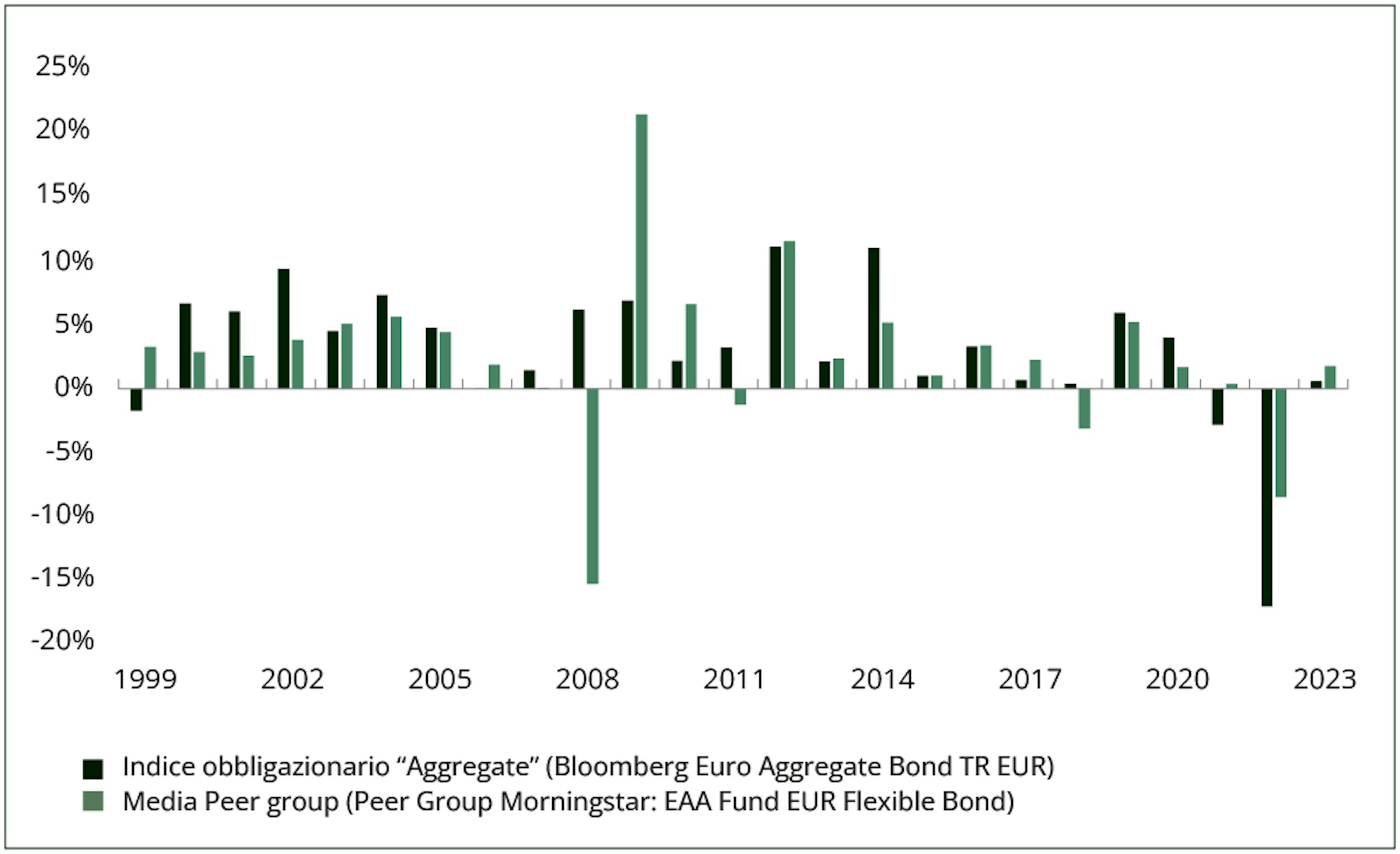 1Da metà 2010 a metà 2011. La categoria Morningstar (EAA Fund EUR Flexible Bond) ha registrato un rendimento del +4,4%, mentre il mercato (Bloomberg Euro Aggregate Bond Index) ha registrato un -0,13%.