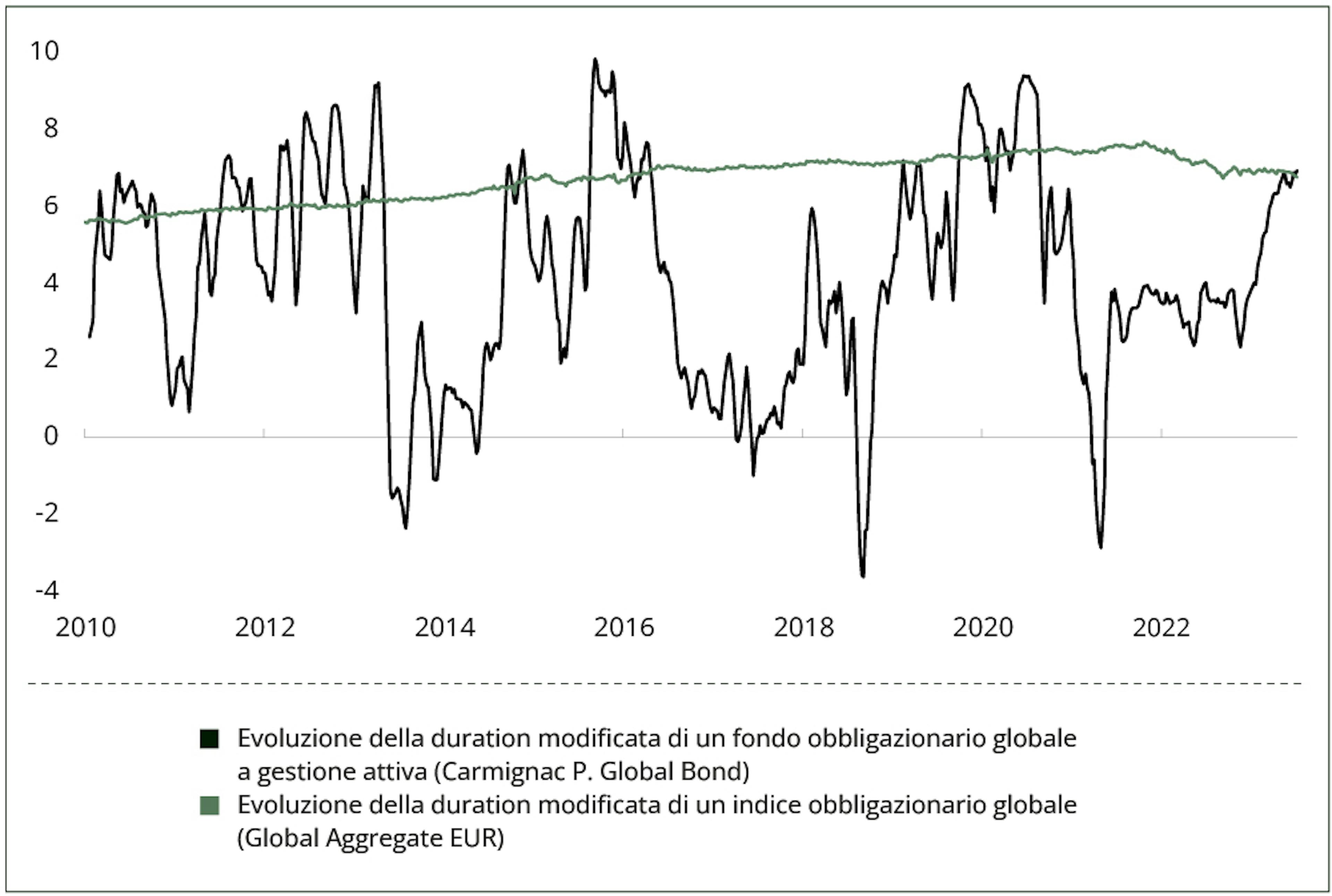 Evoluzione della duration modificata di un fondo obbligazionario globale gestito attivamente e di un indice obbligazionario globale