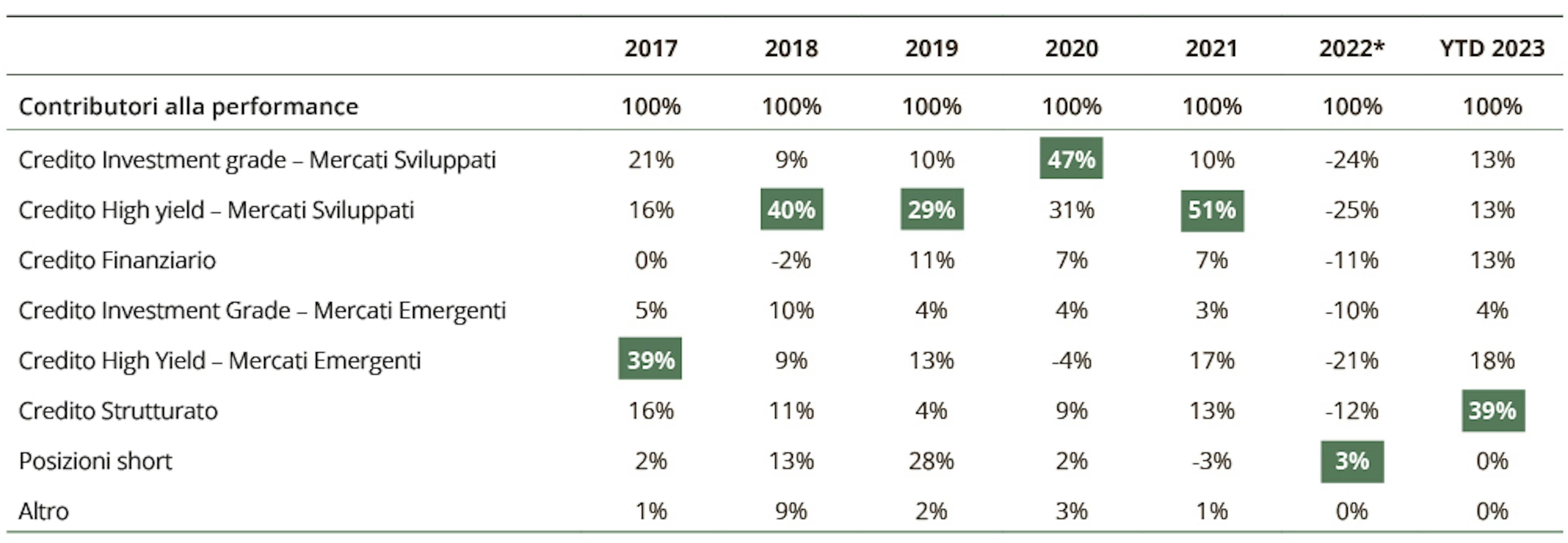 Fonte: Carmignac, ottobre 2023. Il Fondo ha sovraperformato ogni anno solare dal suo lancio. L’anno 2022 è stato l’unico con una performance relativa positiva ma una performance assoluta negativa, il che significa che alcuni contributi alla performance sono stati negativi. Un contributo negativo in un determinato periodo indica che il segmento di mercato preso in considerazione ha avuto un impatto negativo sulla performance nel periodo in questione.