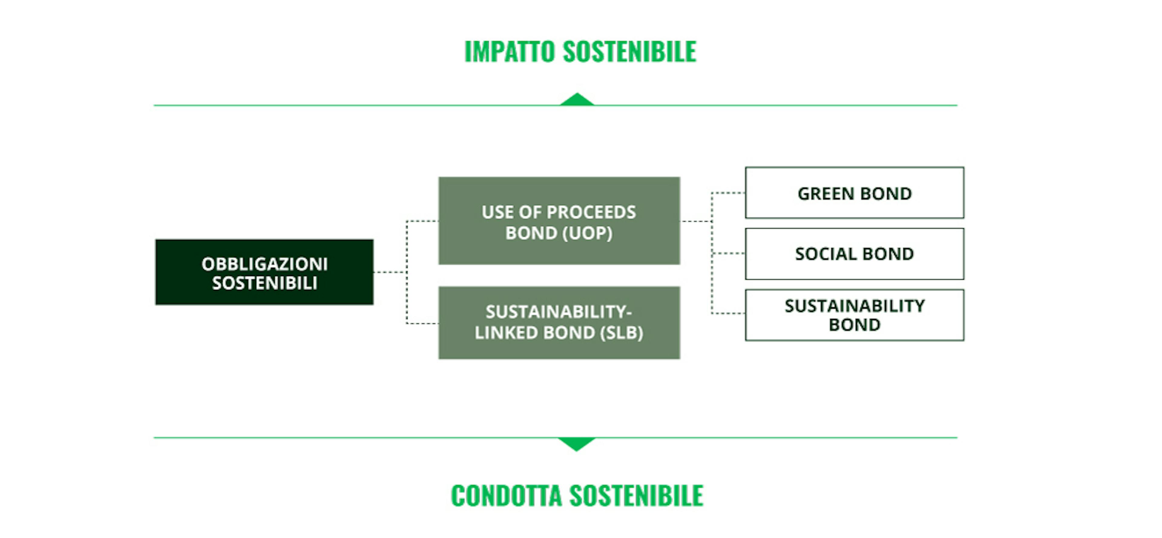 • Un approccio “Use of Proceeds” (per le obbligazioni UoP), dove l’emittente si impegna a destinare i proventi realizzati a beneficio di un determinato progetto ambientale e/o sociale. A questa categoria appartengono principalmente obbligazioni green, sociali e legate alla sostenibilità. Anche le obbligazioni blue e transition (legate a progetti marini o alla transizione energetica) rientrano in questa categoria;