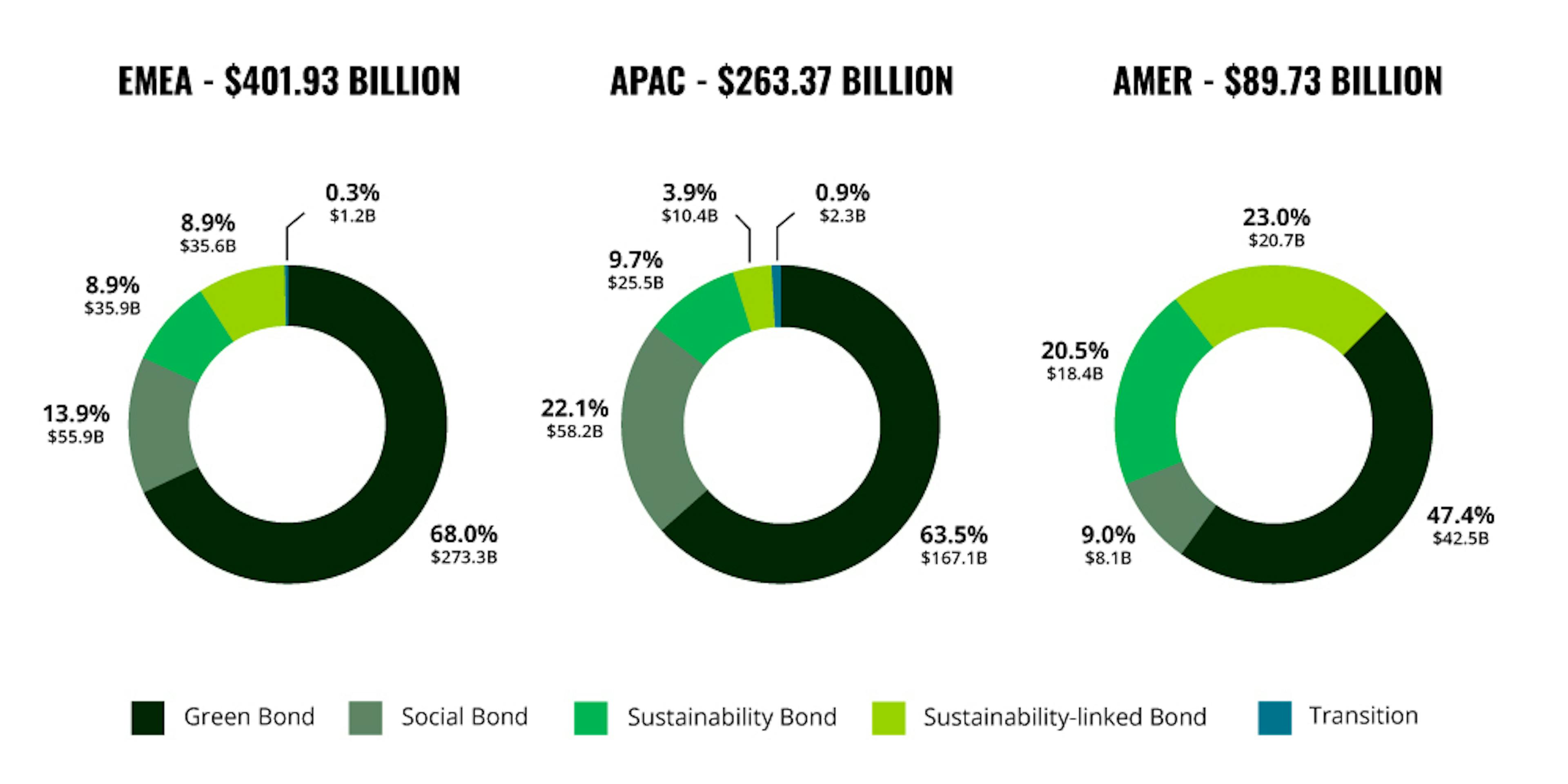 I dati del 2023 hanno evidenziato un volume record di emissioni di obbligazioni green “use of proceeds”, che si sono attestate al primo posto nell’area EMEA, APAC e in America, e una forte diminuzione dei volumi di emissioni di obbligazioni SLB.