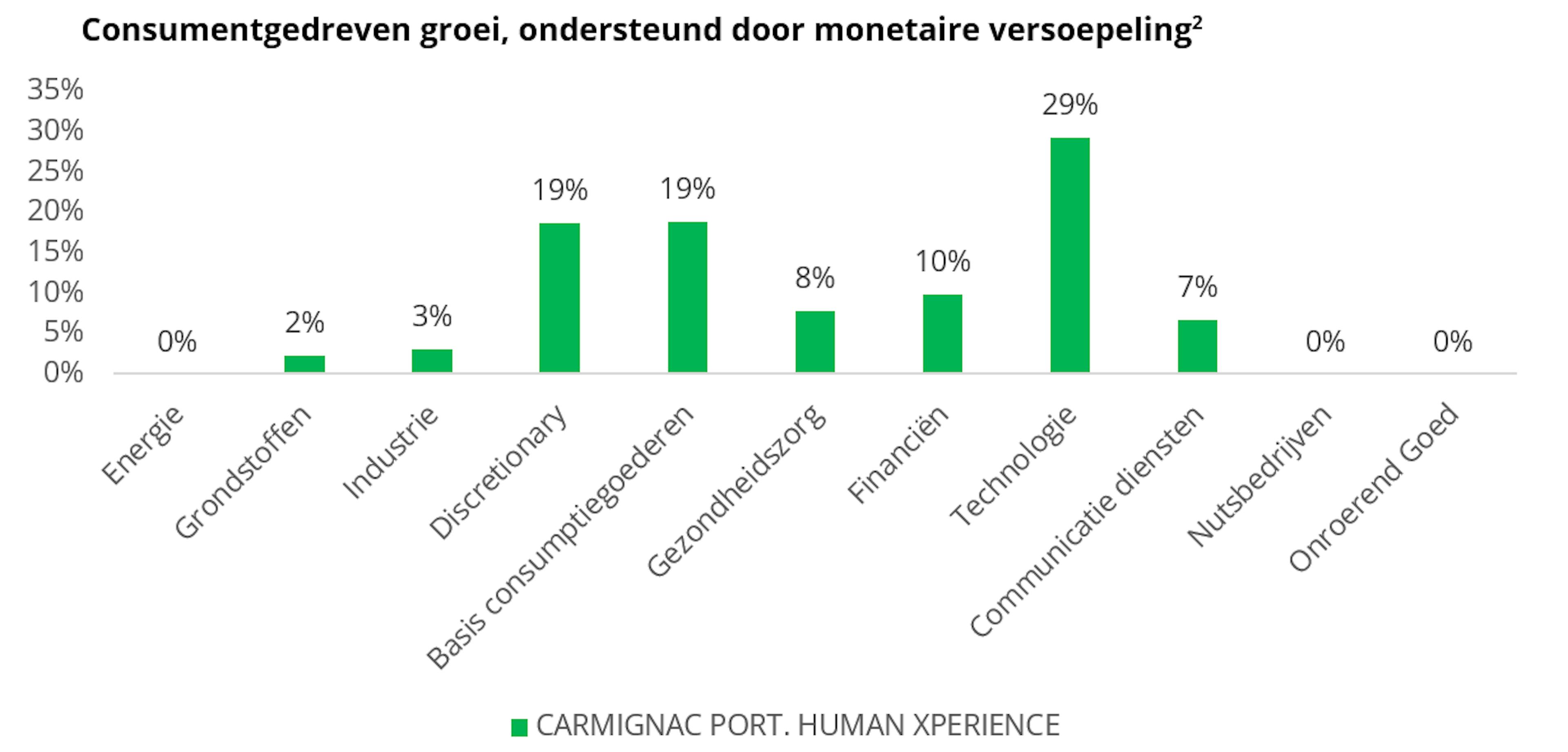 Carmignac Portfolio Human Xperience legt de nadruk op veerkrachtige groeisectoren zoals niet-duurzame consumptiegoederen, consumptiegoederen, gezondheidszorg en consumententechnologie, terwijl sterk gereglementeerde en cyclische sectoren zoals energie, materialen en nutsbedrijven worden vermeden. Deze focus zorgt voor blootstelling aan bedrijven met een duurzame vraag en sterkere bestuursnormen.