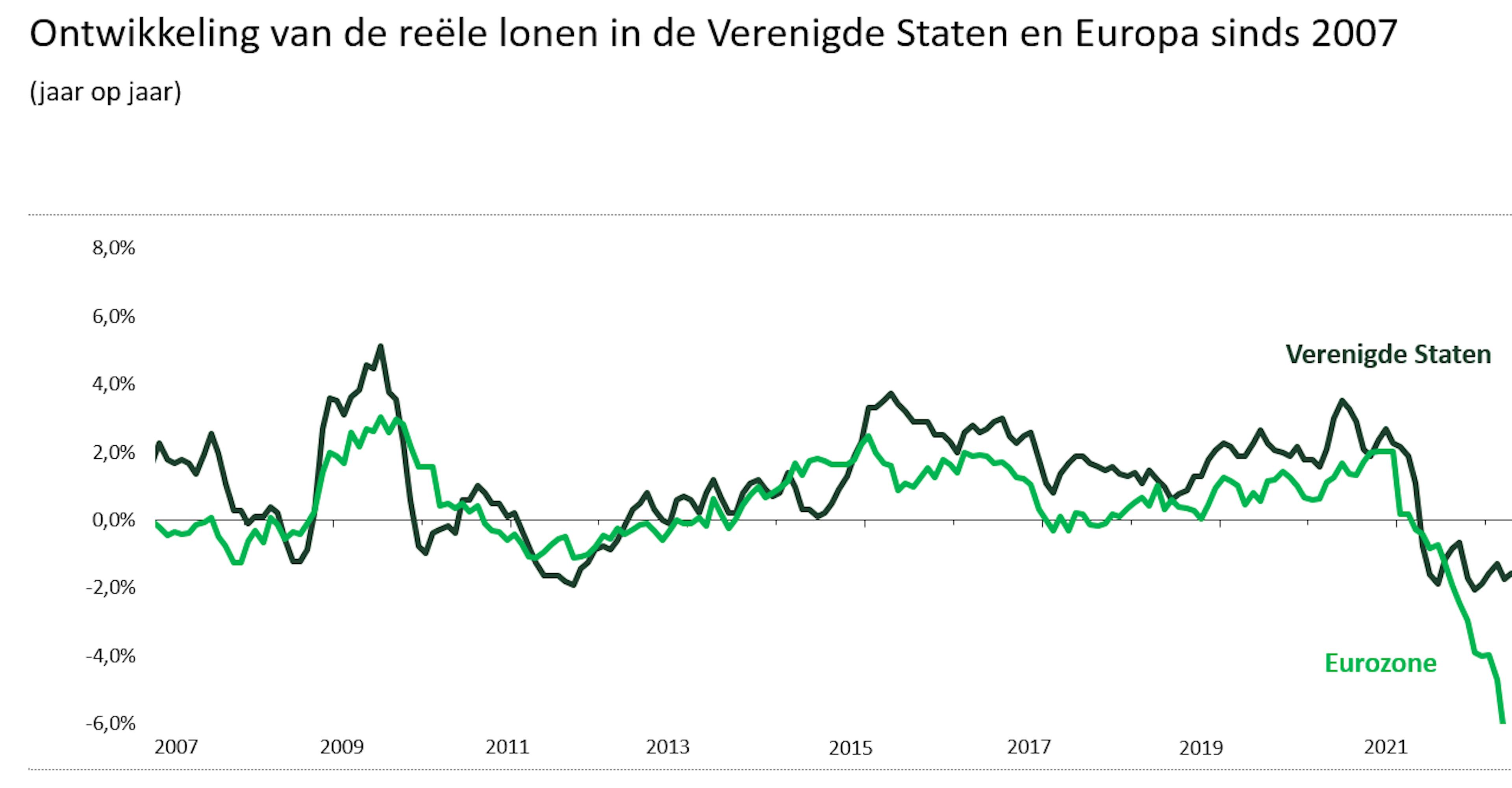 In Europa is de forse stijging van de inflatie vooral te wijten aan de hogere energieprijzen en de beperkingen aan de aanbodzijde. De consumptie wordt namelijk afgeremd doordat de reële inkomens sterk zijn gedaald, zonder noemenswaardige correctie. Een dergelijke ontwikkeling kan alleen maar leiden tot een forse vertraging.