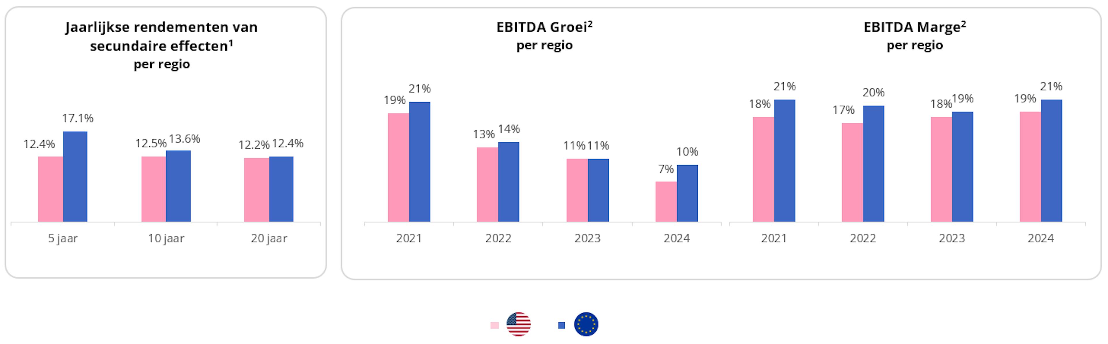 In het afgelopen decennium hebben Europese secundaire fondsen consequent nettorendementen tussen 12% en 17% behaald, waarmee ze vaak beter presteerden dan hun Amerikaanse tegenhangers, zoals hieronder te zien is. Maar wat nog belangrijker is dan de cijfers, is hoe die rendementen zijn gegenereerd — gedreven door grondbeginselen zoals omzetgroei en marge-uitbreiding.
