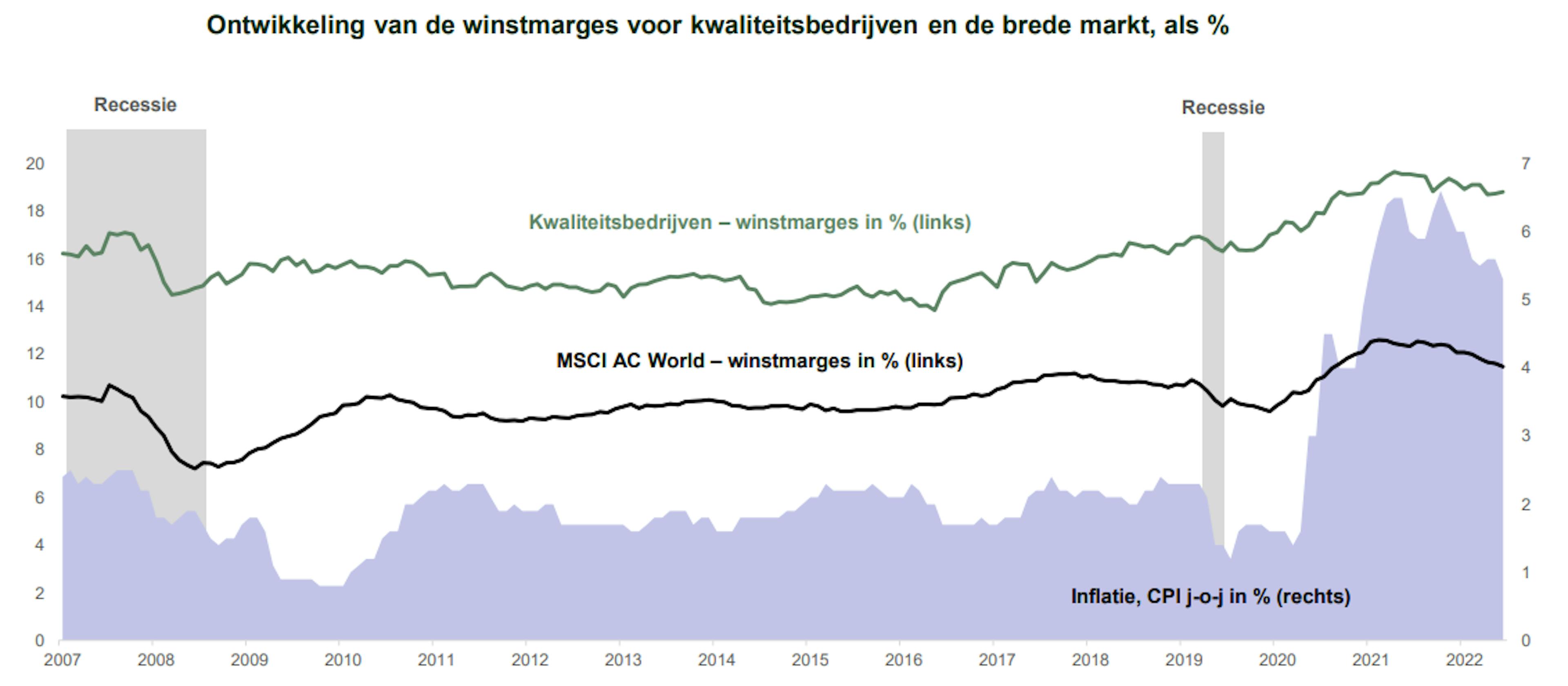 In dit klimaat gaat onze voorkeur uit naar kwaliteitsbedrijven met verschillende aantrekkelijke eigenschappen. Dankzij hun concurrentievoordelen genieten ze hogere winstmarges, die doorgaans ook stabieler zijn. Dat hebben ze ook te danken aan het feit dat ze hun marktaandeel kunnen veiligstellen en hun klantenbestand erg stabiel is. Met de dalende verkoopvolumes en prijsstijgingen vers in het geheugen gegrift, zijn dit erg waardevolle eigenschappen. Aandelenbeleggers zullen zich moeten afvragen in hoeverre de desinflatie en de economische vertraging op het uitgavenpatroon zullen wegen, met het bijkomende risico dat de winstmarges verdampen door een prijzenoorlog.