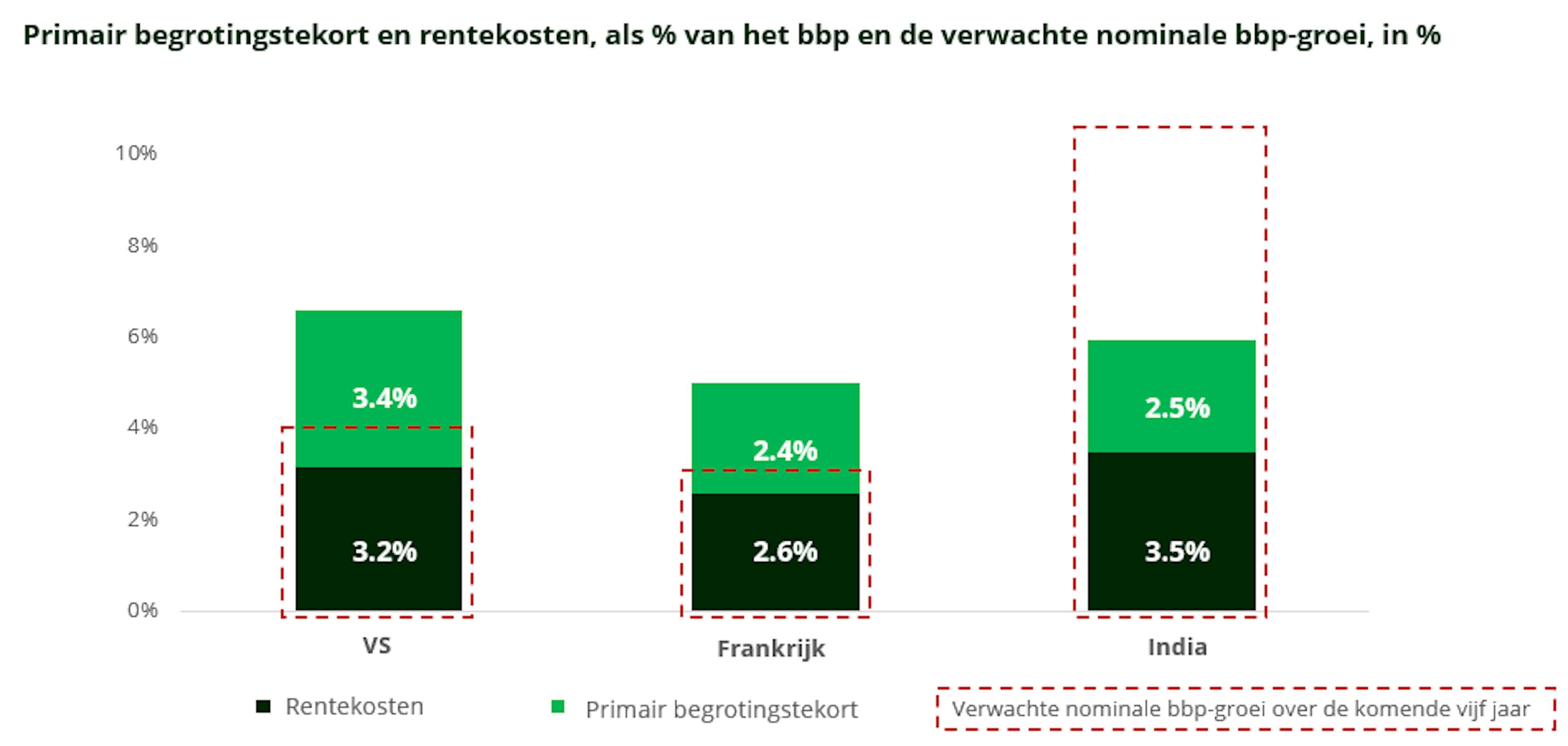 Bovendien moet er zorgvuldig onderzocht worden in hoeverre een regering zou kunnen bezuinigen op haar uitgaven. Twee van de grootste en mogelijk nog steeds oplopende kostenposten van de overheden die we hier onderzoeken, zijn ten eerste sociale uitkeringen en toeslagen en ten tweede rentekosten. Deze eerste zijn onlosmakelijk verbonden met de maatschappelijke vergrijzing van ontwikkelde landen, een toenemende vraag naar sociale uitkeringen, toeslagen en de nodige uitgaven voor decarbonisatie en defensie. Momenteel ogen de netto-rentekosten van alle drie de landen ongeveer even hoog – 2,6% tot 3,5% van het bbp –, maar in de toekomst zal het verschil tussen deze landen waarschijnlijk oplopen. De Indiase rente-uitgaven gaan de komende jaren naar verwachting geleidelijk dalen, terwijl die van Frankrijk en de VS waarschijnlijk op zijn best hetzelfde blijven2.