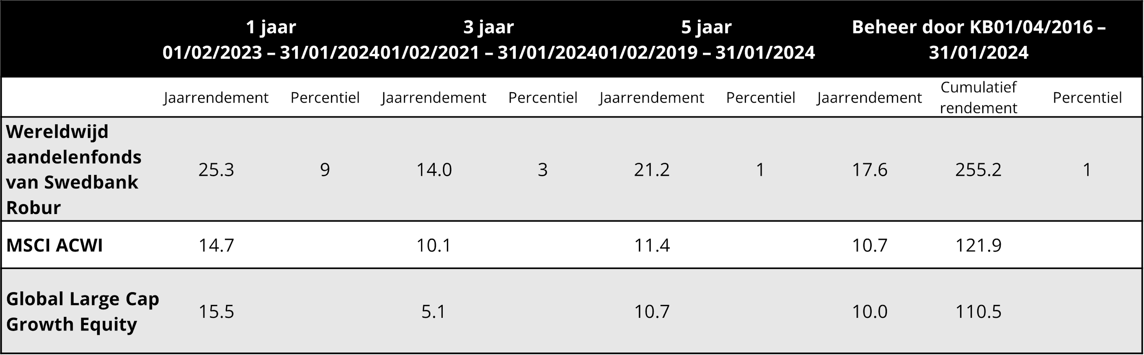 201/04/2016 – 31/01/2024. Strategie = 255,2%. Index (MSCI ACWI) = 121,9%. Gemiddelde van de categorie (Global Large Cap Growth Equity) = 110,5%. Fondsvermogen = stijging van EUR 1,8 miljard naar EUR 10 miljard. Prestaties gemeten in euro.