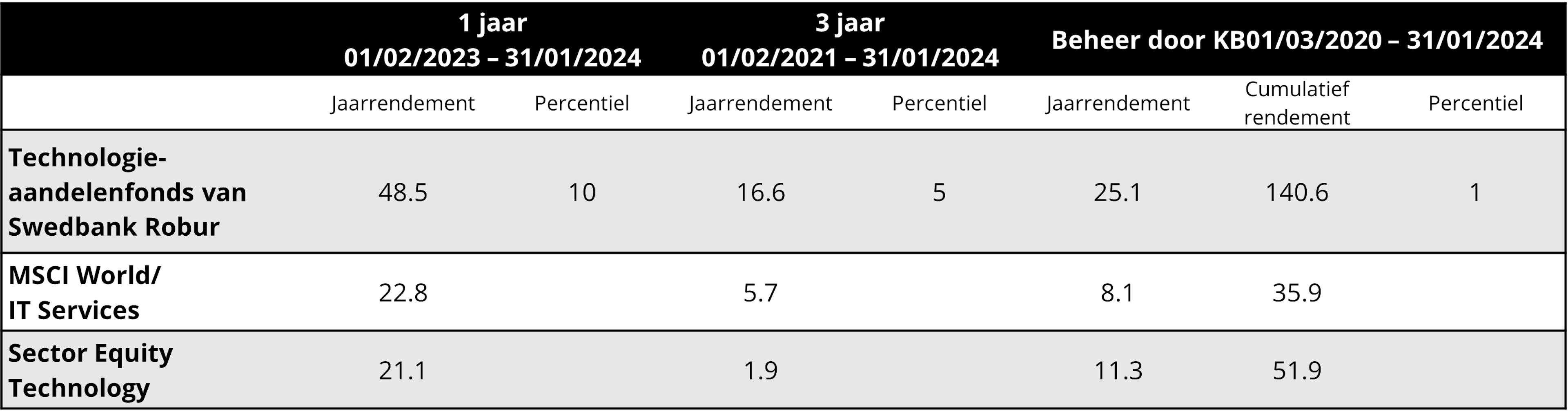 301/03/2020 – 31/01/2024. Strategie= 140,6%. Index (MSCI World/IT Services) = 35,9%. Gemiddelde van de categorie (Sector Equity Technology) = 51,9%. Fondsvermogen = stijging van EUR 4,6 miljard naar EUR 12,8 miljard. Prestaties gemeten in euro.