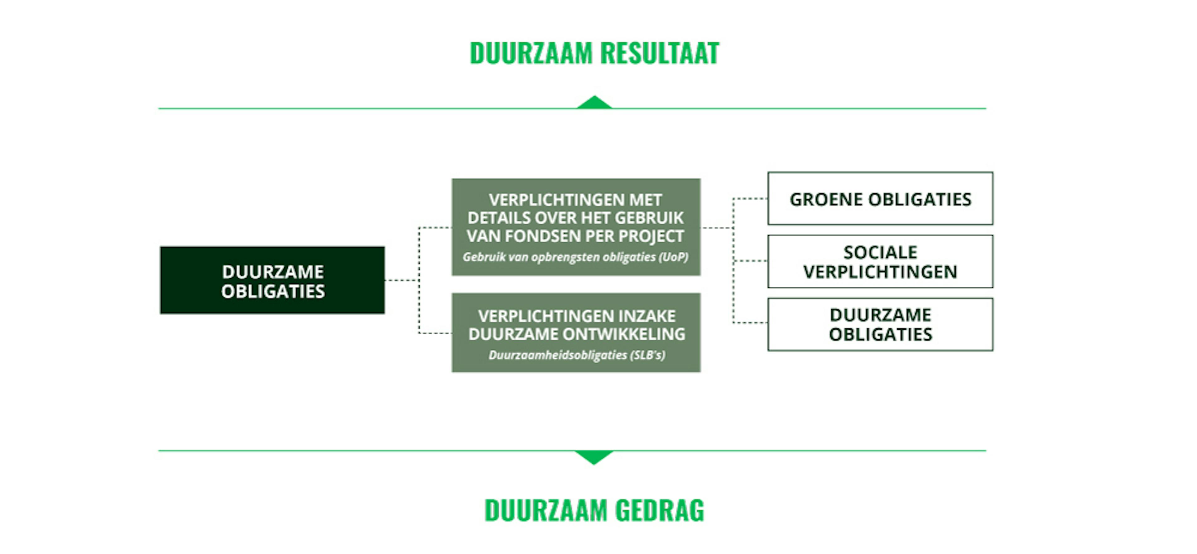 Duurzaamheidsdoelstellingen (voor SLB's): de opbrengsten van een emissie worden gebruikt voor algemene bedrijfsdoeleinden en zijn niet bestemd voor een specifiek ecologisch en/of sociaal project. Op het moment van de emissie kiest de emittent echter een of meerdere duurzaamheidsgerelateerde prestatiekernindicatoren (Key Performance Indicators, KPI's) en duurzaamheidsprestatiedoelstellingen (Sustainability Performance Targets, SPT's), en verbindt hij zich ertoe deze voor een bepaalde datum te verwezenlijken. Als de emittent de SPT's niet haalt, wordt dit meestal bestraft door tijdens de resterende looptijd van de obligatie een couponverhoging of premie toe te passen.