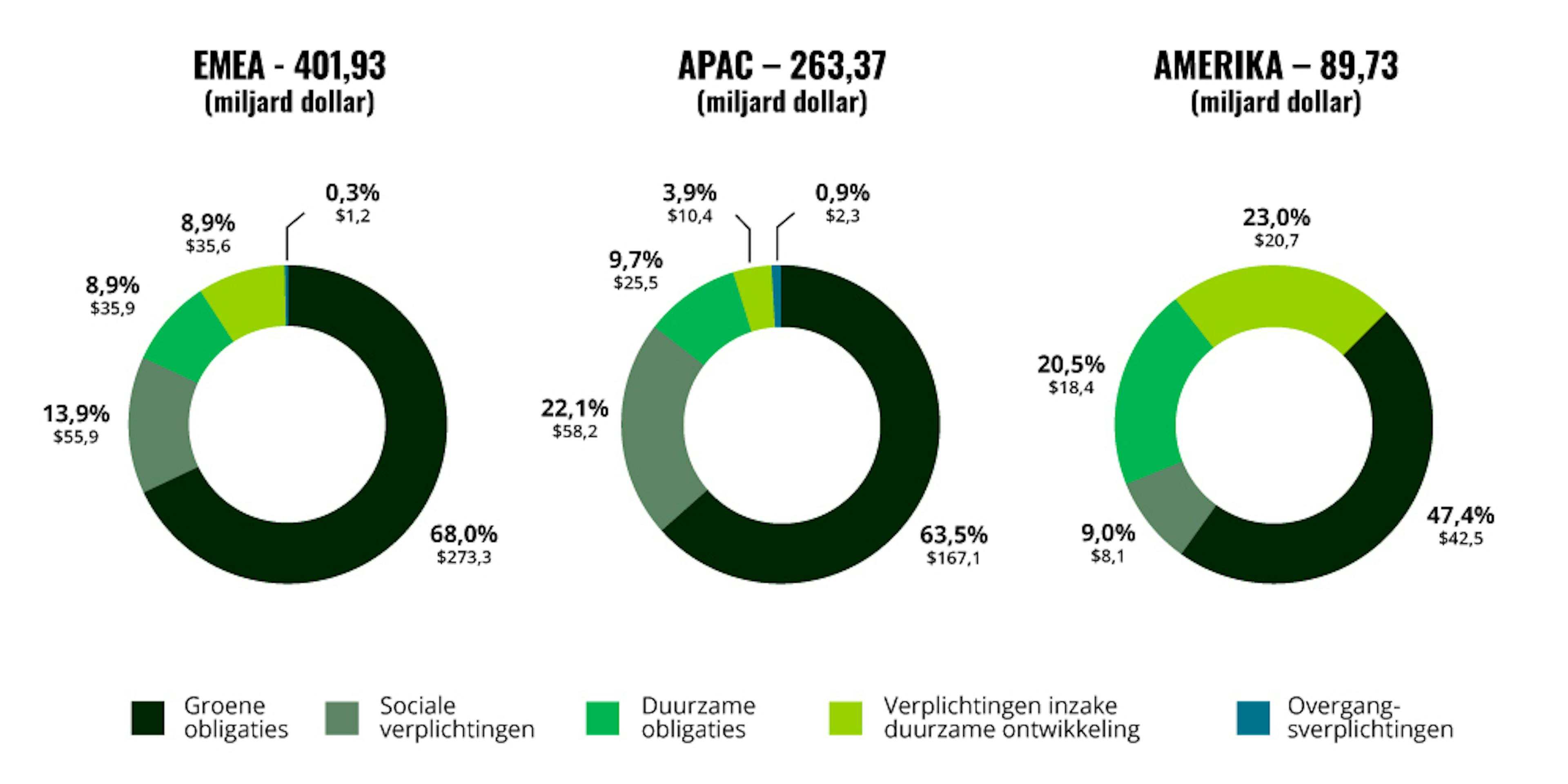 De cijfers uit 2023 wijzen op een recorduitgifte van groene UoP-obligaties, die het leeuwendeel uitmaakten van de emissies in de EMEA-regio, Azië-Pacific en Amerika, en op een forse daling van het emissievolume van SLB's.