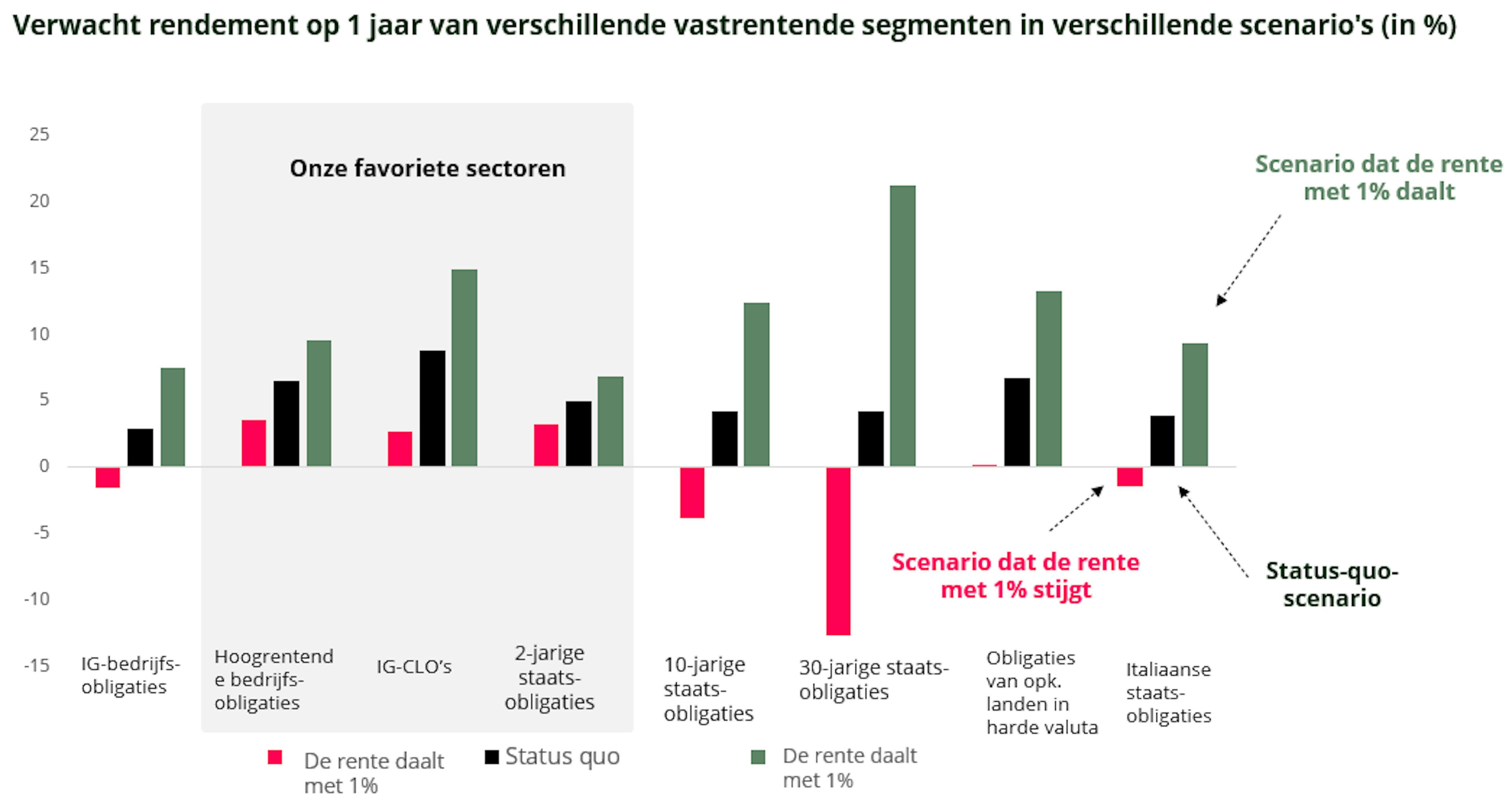 Wat opvalt is dat ons eenvoudig maar realistisch model laat zien dat sommige segmenten in het universum van de vastrentende waarden in elk van de drie scenario's een positief rendement zouden opleveren: hoogrentende bedrijfsobligaties, gestructureerd krediet en kortlopende staatsobligaties zijn zeer aantrekkelijk en spelen dan ook een belangrijke rol in onze allocatie.