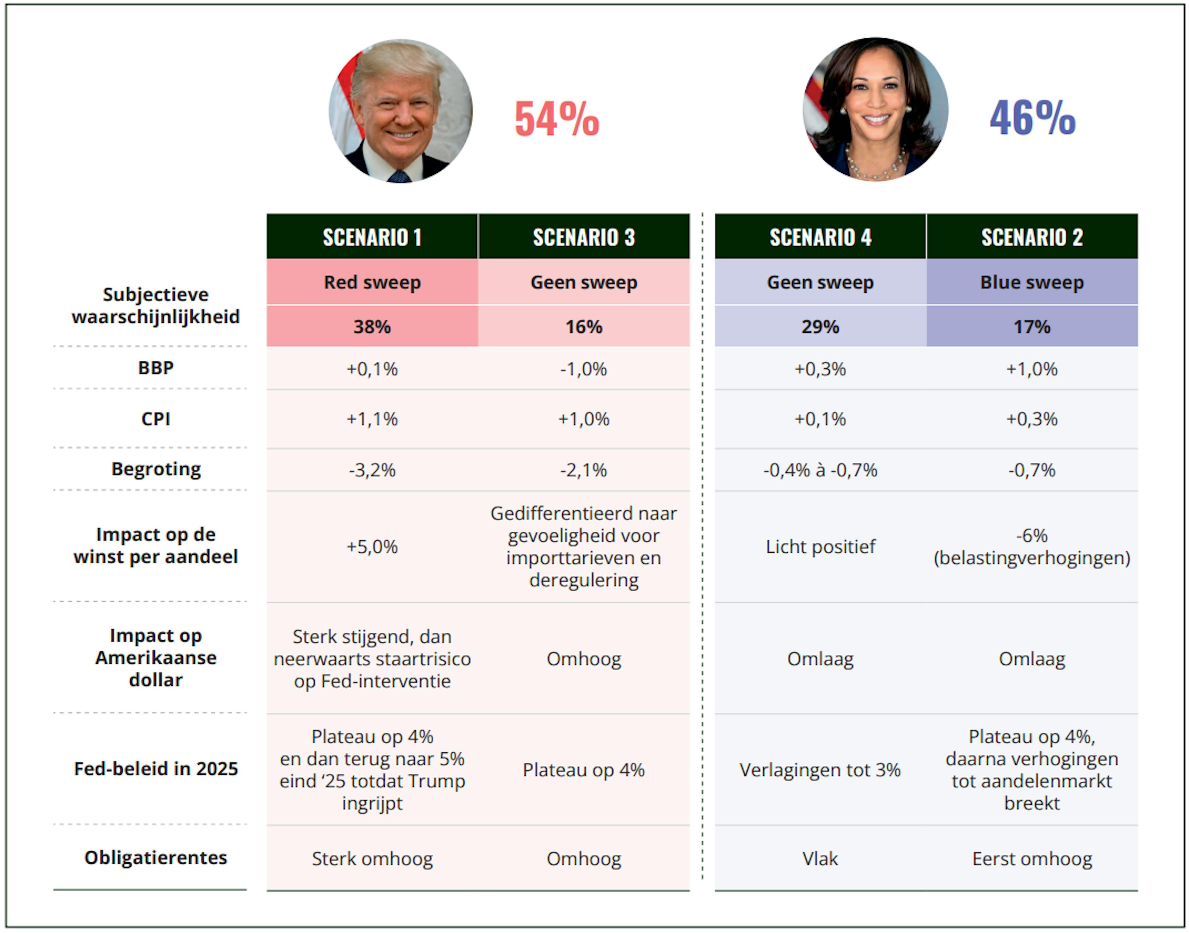 Impact van de verkiezingsuitslag op jaarbasis in 2025-2026 ten opzichte van de huidige trend. Gebaseerd op berekeningen van Carmignac per 21/10/2024.