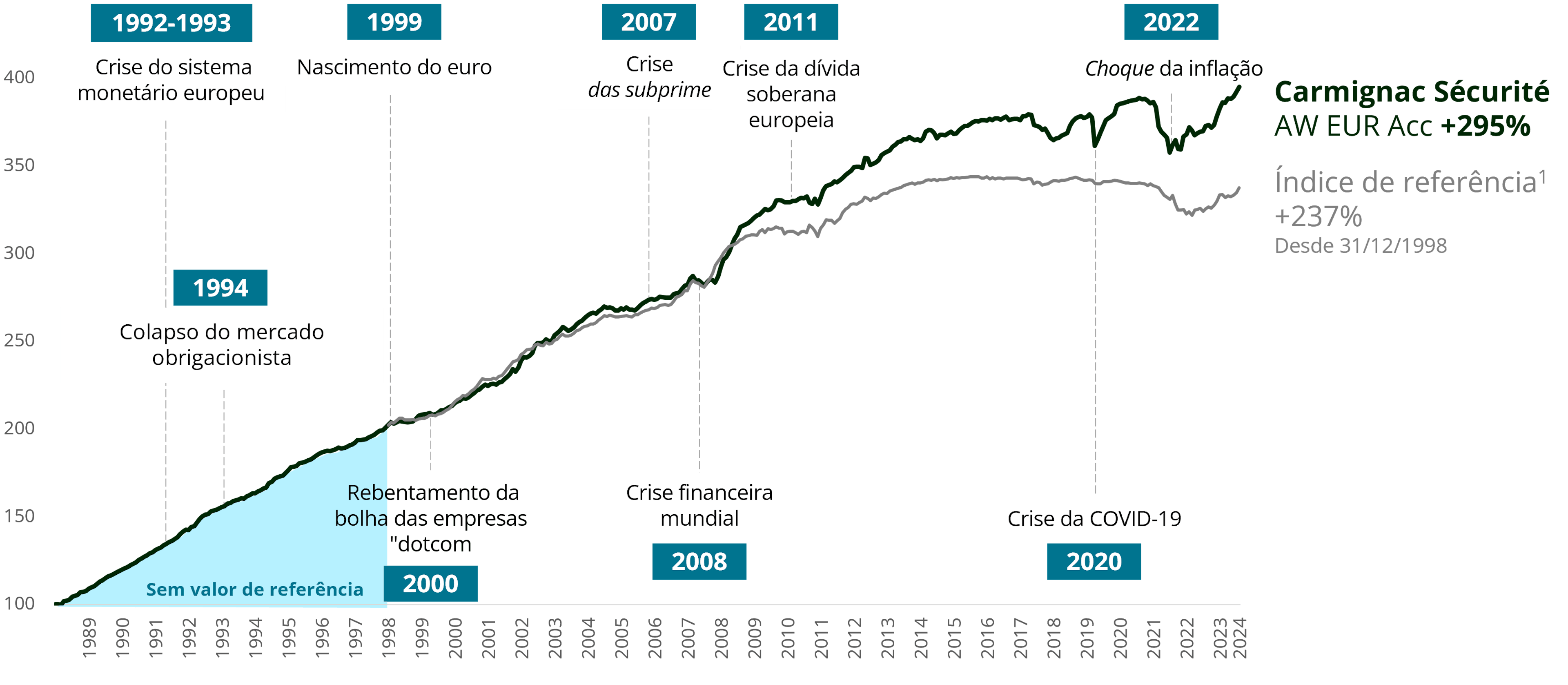 Fonte: Carmignac. Performance acumulada desde o lançamento do Fundo em 26/01/1989 até 31/07/2024 e do índice de referência de 31/12/1998 a 31/07/2024. (1) Índice de referência: ICE BofA ML 1-3 Year All Euro Government Index (com reinvestimento de cupões). Até 31 de dezembro de 2020, o valor de referência foi o Euro MTS 1-3 anos (a partir de 31/12/1998, data de introdução do euro, e do índice Euro MTS 1-3 anos). Os rendimentos são apresentados utilizando o método de encadeamento. O desempenho passado não constitui uma garantia de desempenho futuro. Os rendimentos são expressos líquidos de despesas (excluindo quaisquer comissões de subscrição aplicáveis a pagar ao distribuidor), conforme aplicável. O desempenho pode aumentar ou diminuir em resultado das flutuações das taxas de câmbio das unidades de participação que não estejam cobertas por uma cobertura cambial.