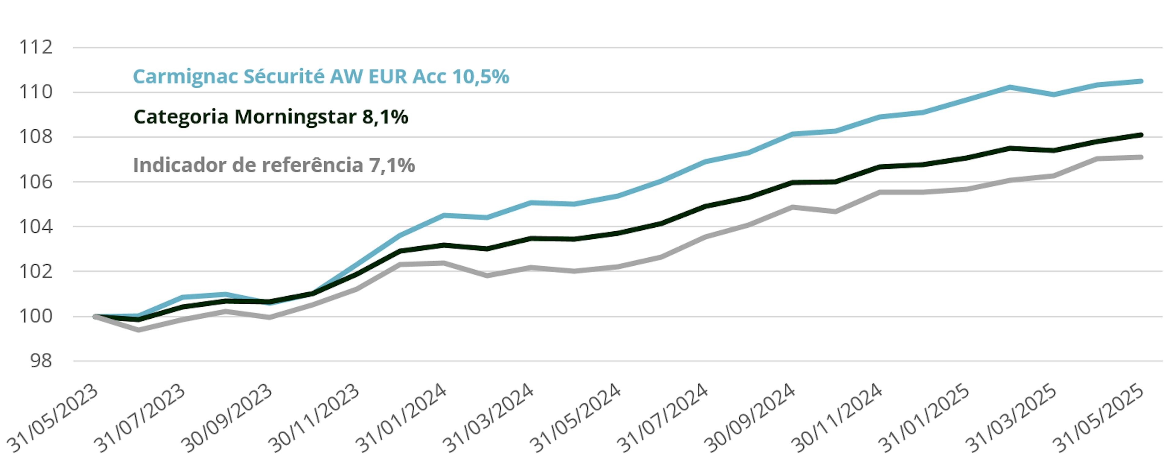 Com base no horizonte de investimento recomendado de dois anos, a Sécurité gerou um sólido retorno de dois dígitos (10,5% para a classe AW Acc em 30/05/2025), o que é tanto mais notável quanto foi alcançado com uma volatilidade de apenas 1,4%2 num ambiente incerto em que os rendimentos das obrigações alemãs a 10 anos flutuaram fortemente entre 2% e 3% e os spreads de crédito foram bem suportados, embora não sem alguma turbulência.