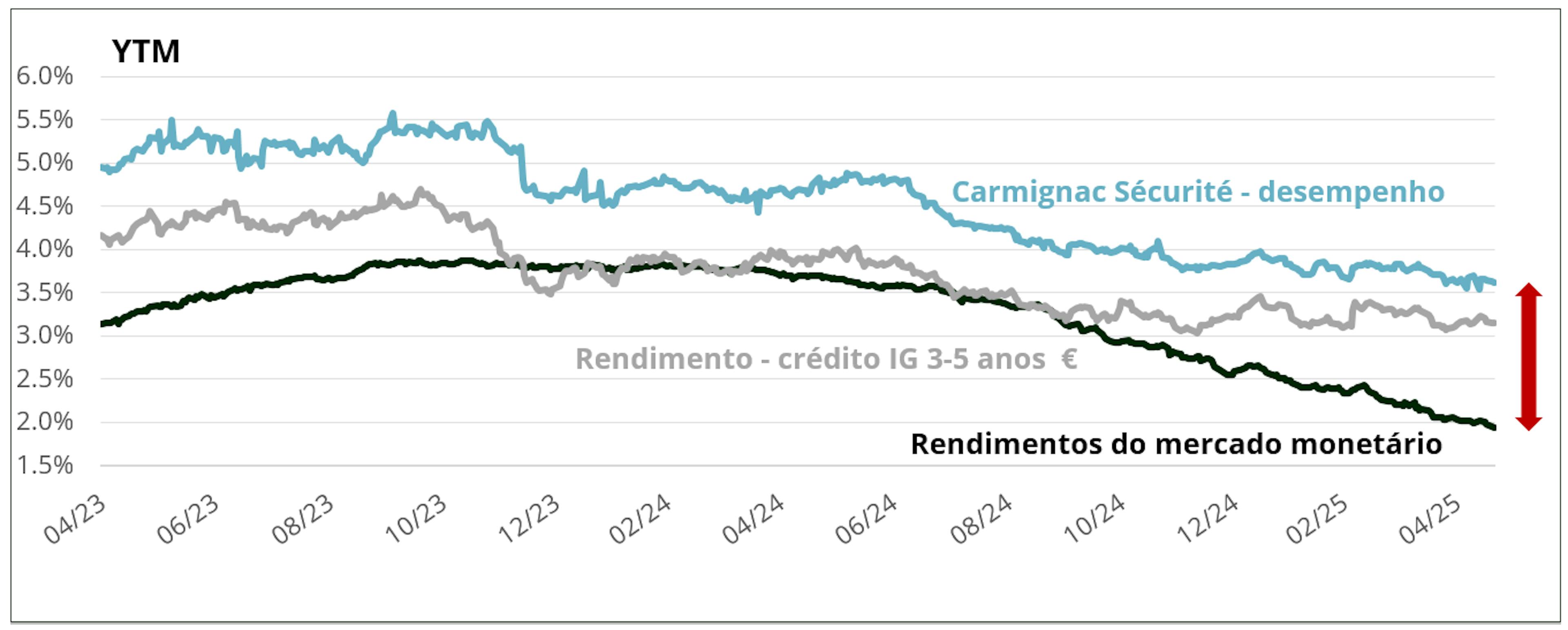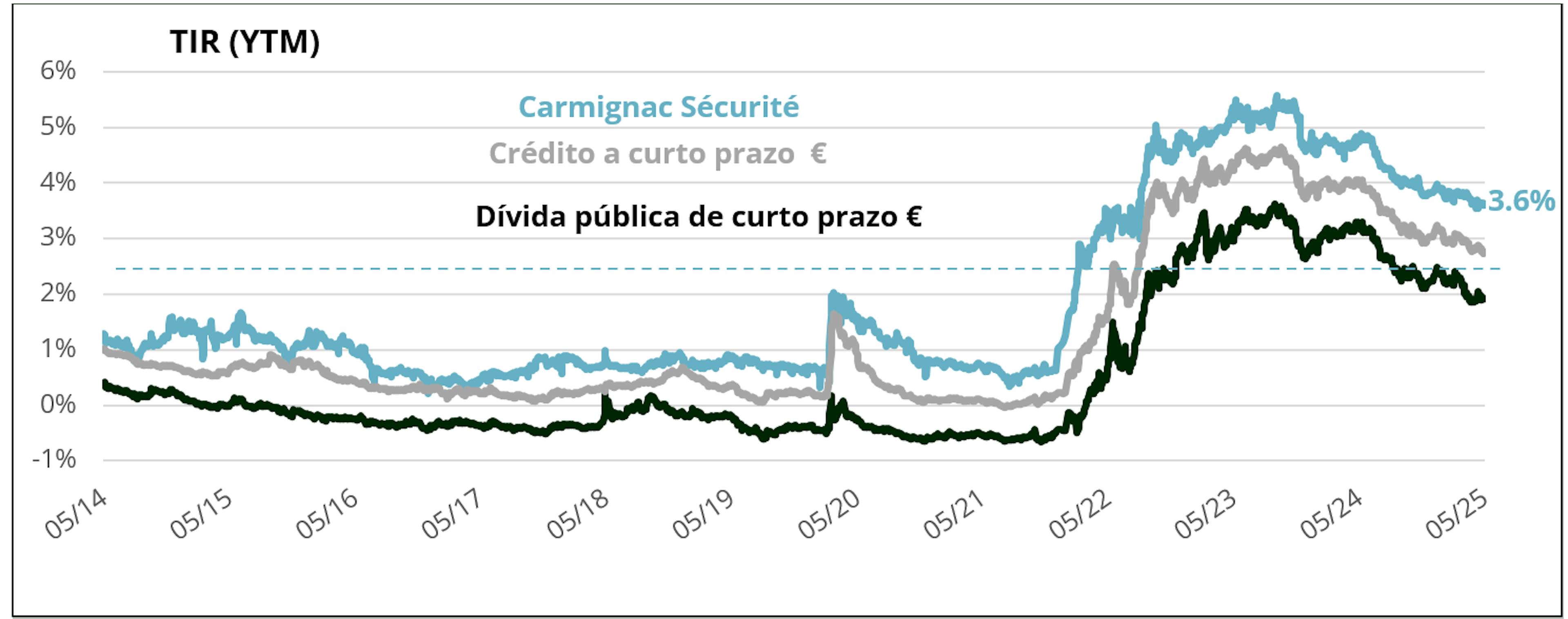Carmignac Sécurité e crédito a 3-5 anos € vs. rendimentos do mercado monetário