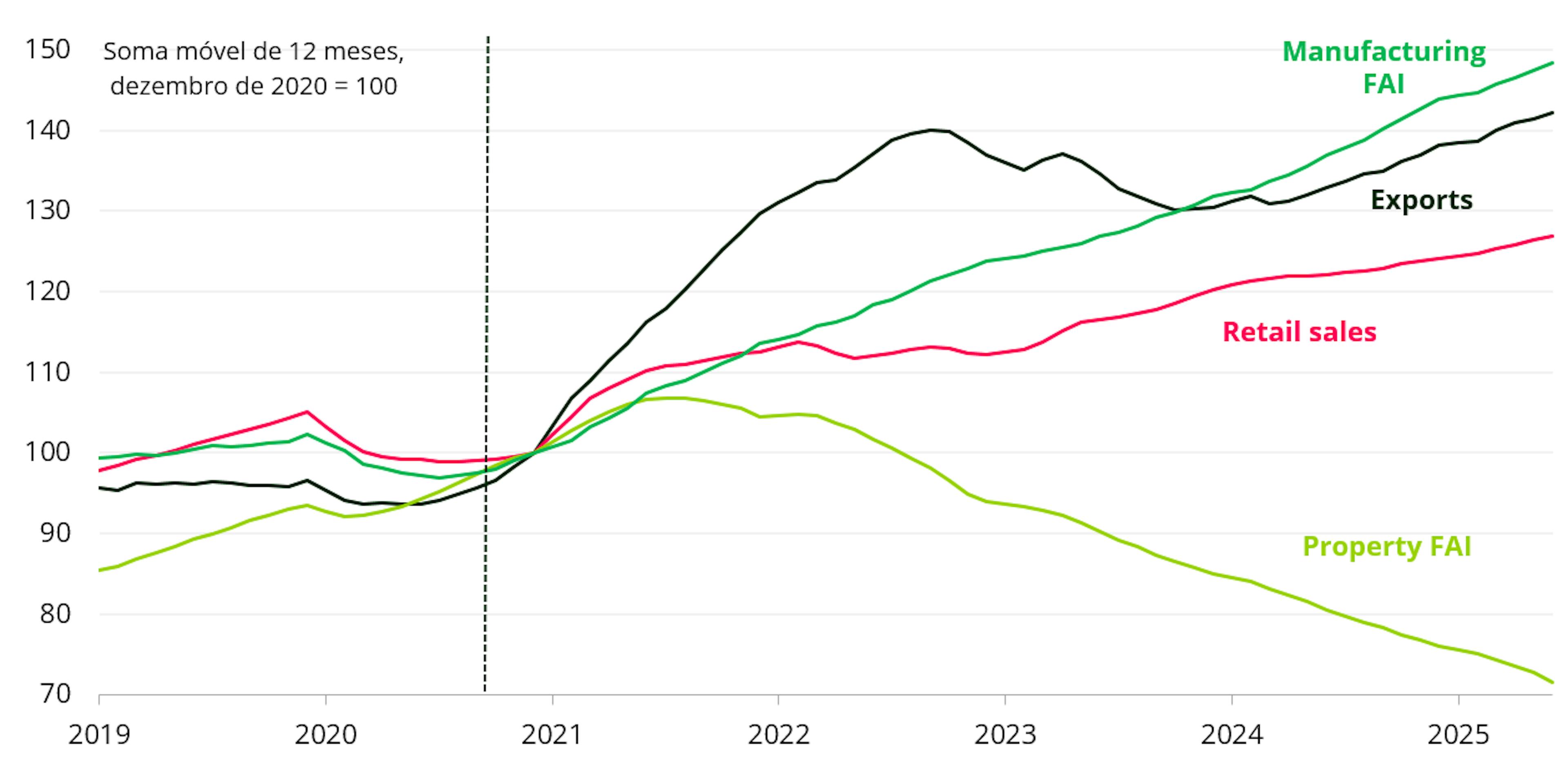 China: Subcomponentes do crescimento. O crescimento robusto da indústria transformadora e das exportações contrasta com o abrandamento do setor imobiliário e o consumo interno moderado.