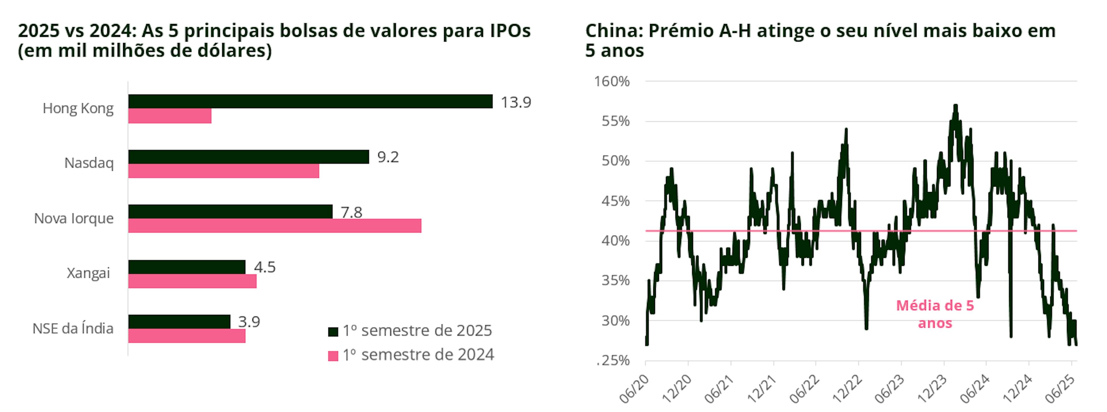 Fatores como o abrandamento das tensões comerciais, o momento «DeepSeek» da China e as avaliações de mercado ainda atraentes em termos relativos impulsionaram os fluxos. Estamos otimistas com o facto de o capital estrangeiro estar disposto a pagar um prémio pelas ações H de empresas chinesas únicas, de qualidade e com valor de escassez, embora continuemos a manter a nossa prudência na avaliação. Parte da recente onda de IPOs em Hong Kong deve-se ao recrudescimento dos receios de que as empresas chinesas sejam retiradas da cotação dos ADR nos EUA. Esta manifestação das tensões entre os EUA e a China nos mercados é uma presença constante, que se intensifica com as ondas de protecionismo. É algo que já vimos antes e não acreditamos que esta última pressão – aparentemente desencadeada pela declaração do Secretário do Tesouro dos EUA, Bessent, de que «tudo está em cima da mesa» – terá um resultado catastrófico para os ADR chineses, mas reconhecemos que, enquanto a ameaça persistir, haverá uma pressão prejudicial sobre as empresas chinesas cotadas nos EUA sem cotação dupla no seu país.