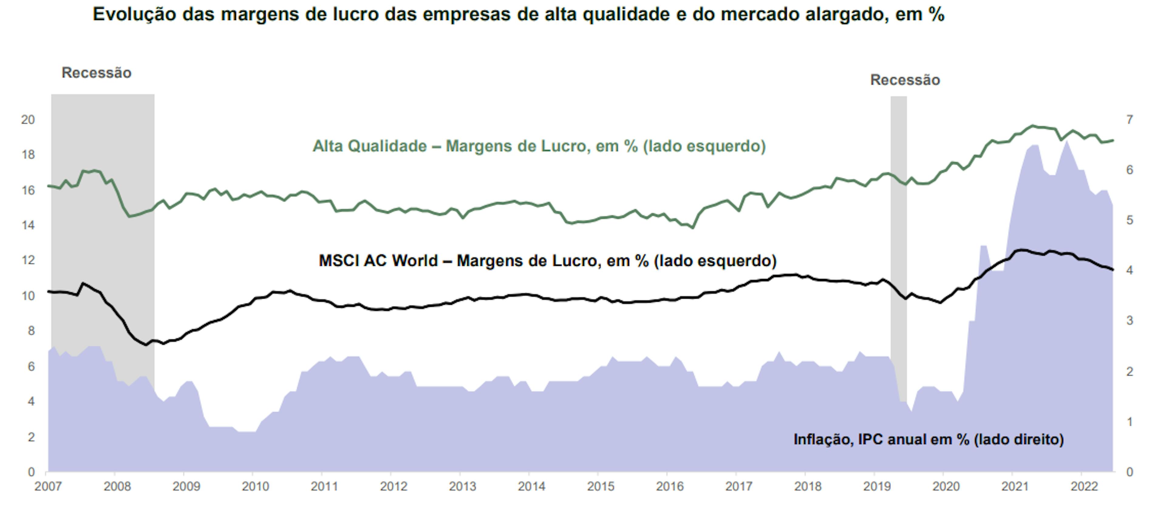 Nesta conjuntura, privilegiamos empresas de alta qualidade que apresentem diversas caraterísticas atrativas. Estas empresas beneficiam de margens de lucro mais elevadas que demonstram uma estabilidade considerável ao longo do tempo. Além disso, a sua capacidade para manter a quota de mercado e a estabilidade da sua base de clientes proporcionam uma certa proteção às margens de lucro. Esta caraterística de extrema importância, sobretudo após um período marcado pelo decréscimo do volume de vendas e pelo aumento dos preços. Efetivamente, no futuro, uma das principais questões para os investidores em ações consiste em perceber de que forma a desinflação e o abrandamento económico irão afetar as despesas, com o risco de as guerras de preços diminuírem as margens.