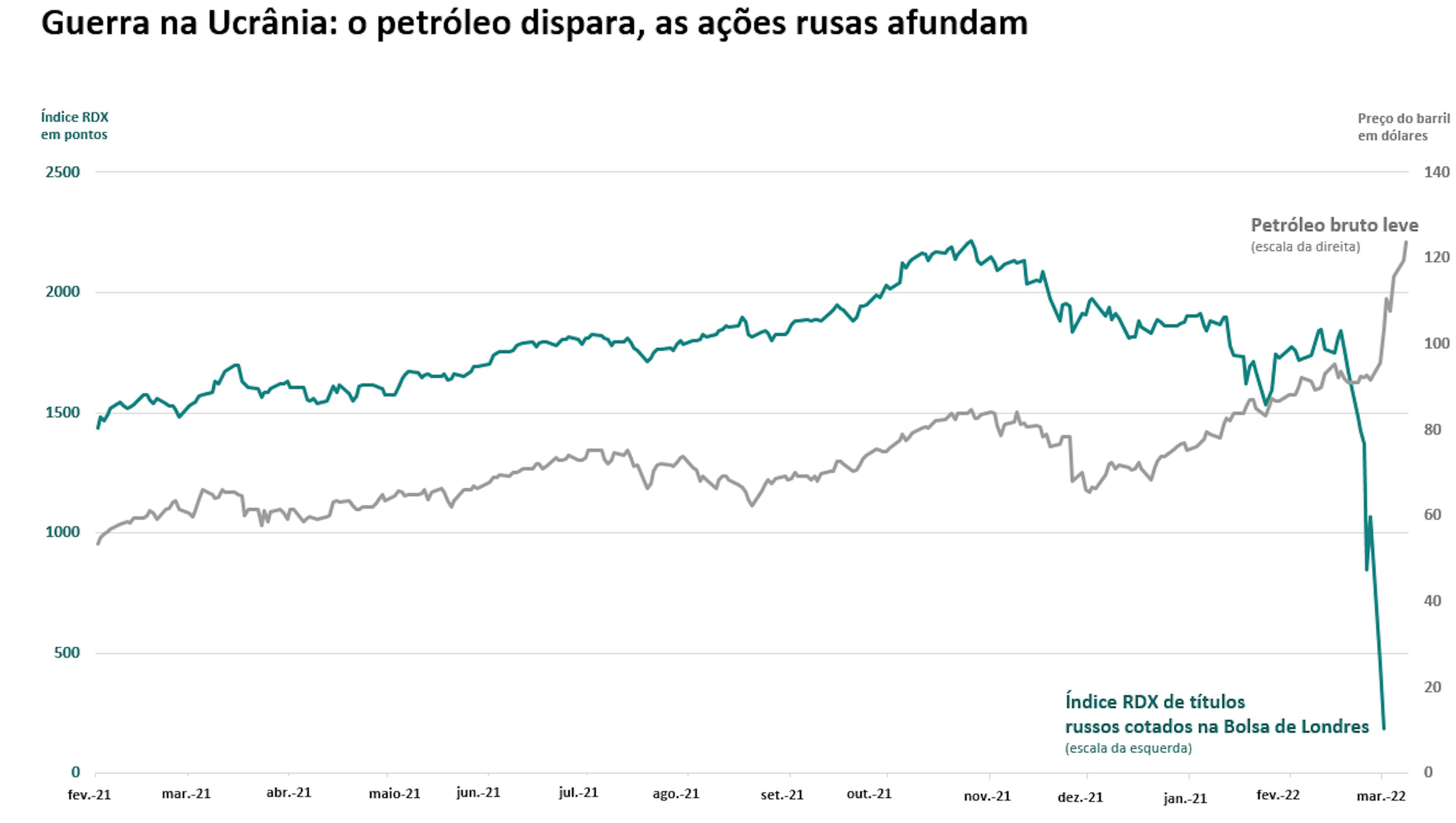Com efeito, os títulos de dívida russa, pública ou privada, perderam quase imediatamente 60% a 80% do seu valor. Simultaneamente, as ações russas cotadas na Grã-Bretanha – a maioria delas de bancos, produtores de petróleo ou outras matérias-primas industriais – perderam 92% a 99% do seu valor entre 16 de fevereiro e 1 de março, véspera da suspensão das cotações. Simultaneamente, os preços do gás na Europa multiplicaram-se momentaneamente por dois e meio, enquanto os preços do petróleo aumentaram 55%.