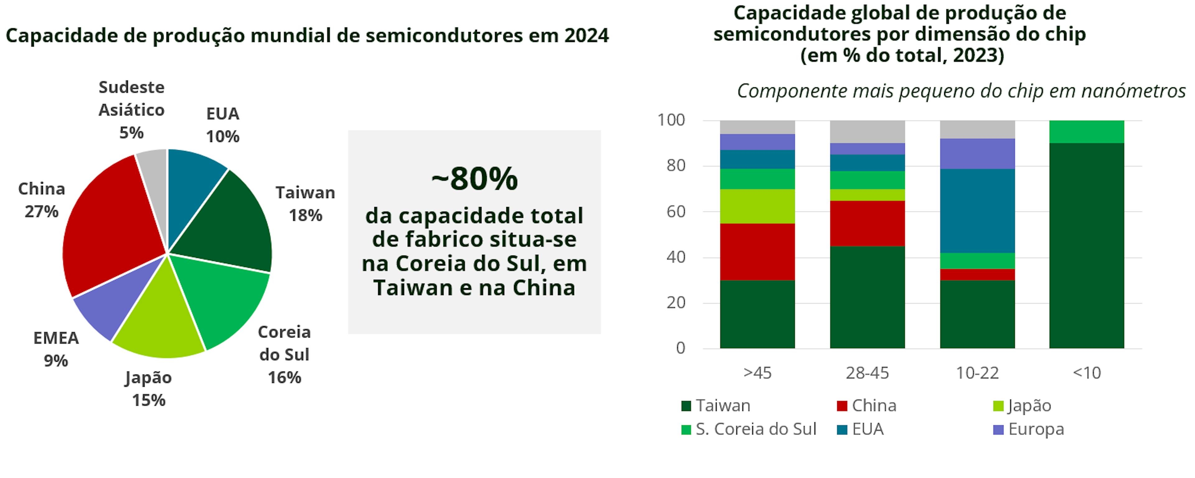 A tecnologia é, sem dúvida, um grande atrativo para os investidores que consideram a Ásia. Historicamente, as ideias e a conceção eram feitas nos EUA, enquanto o fabrico era externalizado para a Ásia. Atualmente, 100% das unidades de processamento gráfico (GPU) da Nvidia são fabricadas pela TSMC de Taiwan e a maior parte dos seus produtos de memória de elevada largura de banda provêm da Hynix da Coreia do Sul. A revolução da IA será impulsionada pela Ásia, e os EUA sabem-no. A administração Trump está a encorajar estas empresas líderes a investirem nos EUA e a produzirem no país. Esta estratégia está a começar a funcionar, e a TSMC já se comprometeu a investir 150 mil milhões de dólares nos EUA, ajudada sem dúvida pela relação tensa de Taiwan com a China.