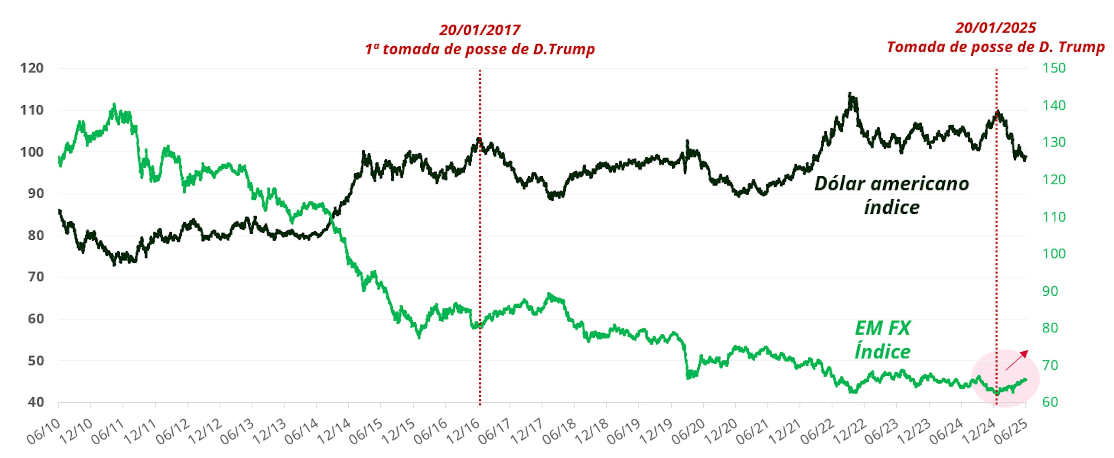 Índice do dólar americano vs. índice JP Morgan EM FX desde 2010