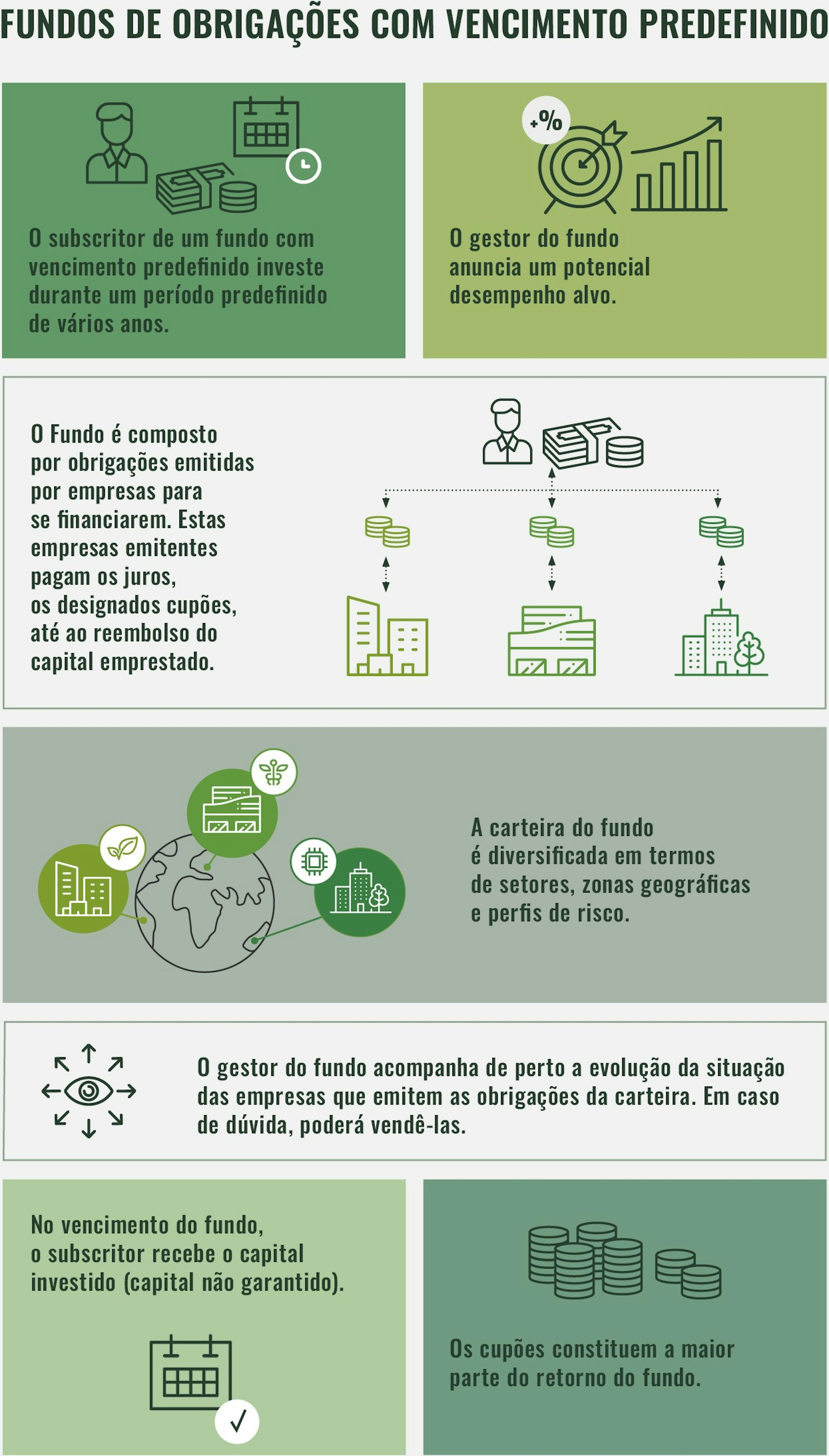 Os subscritores de um fundo com vencimento predefinido investem num horizonte temporal predeterminado – geralmente vários anos. Todavia, podem vender este investimento antes do seu vencimento, sendo que o valor da venda dependerá das condições de mercado.