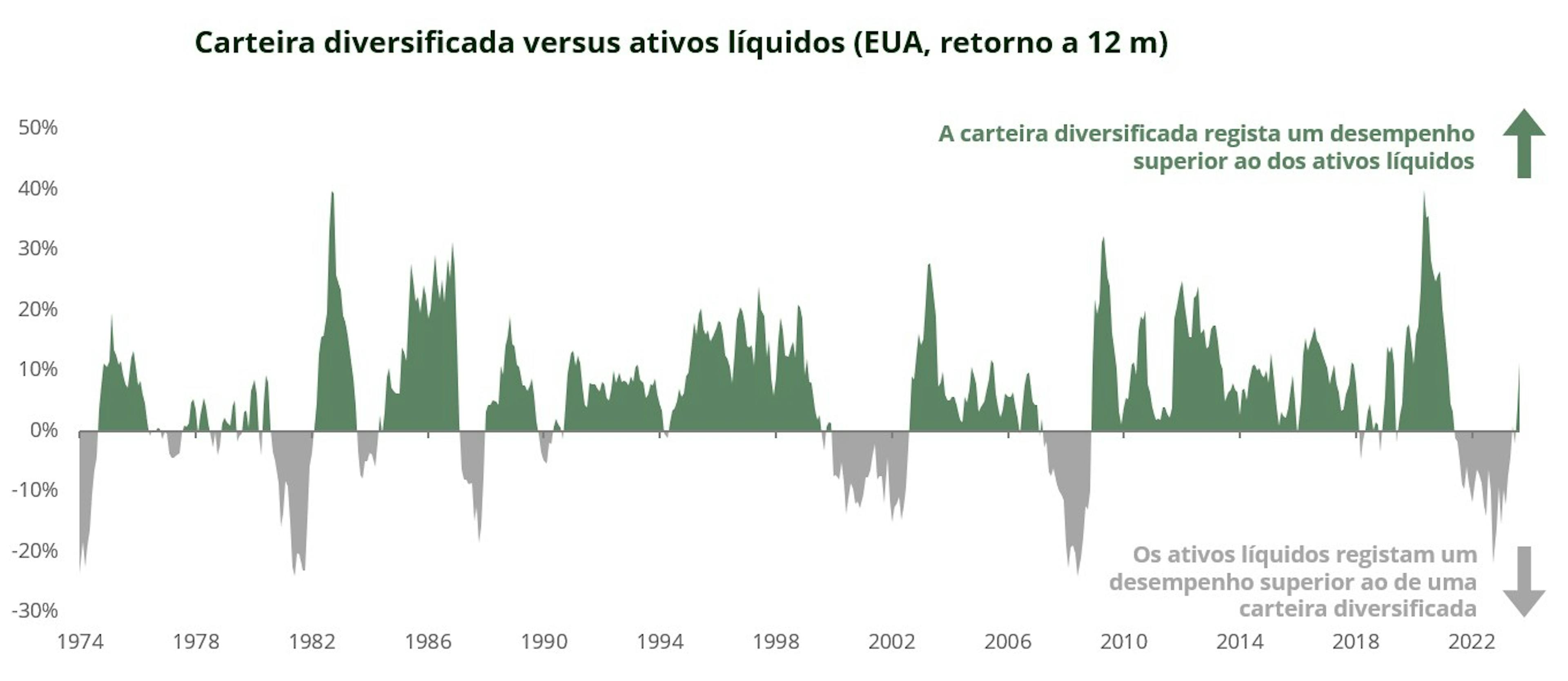 De facto, a carteira de cash/equivalentes é uma boa opção de salvaguarda, sobretudo em períodos de estagflação3. No entanto, é difícil prever o momento certo. Assim, e partindo do pressuposto de que esta pode constituir uma referência, a história sugere que os investidores beneficiam mais se investirem numa carteira diversificada composta por ações e obrigações, mesmo quando o caixa e os equivalentes de caixa registam rendibilidades tão ou mais elevadas do que os prémios de risco das ações, as yields das obrigações de empresas ou as obrigações com prazos mais longos.