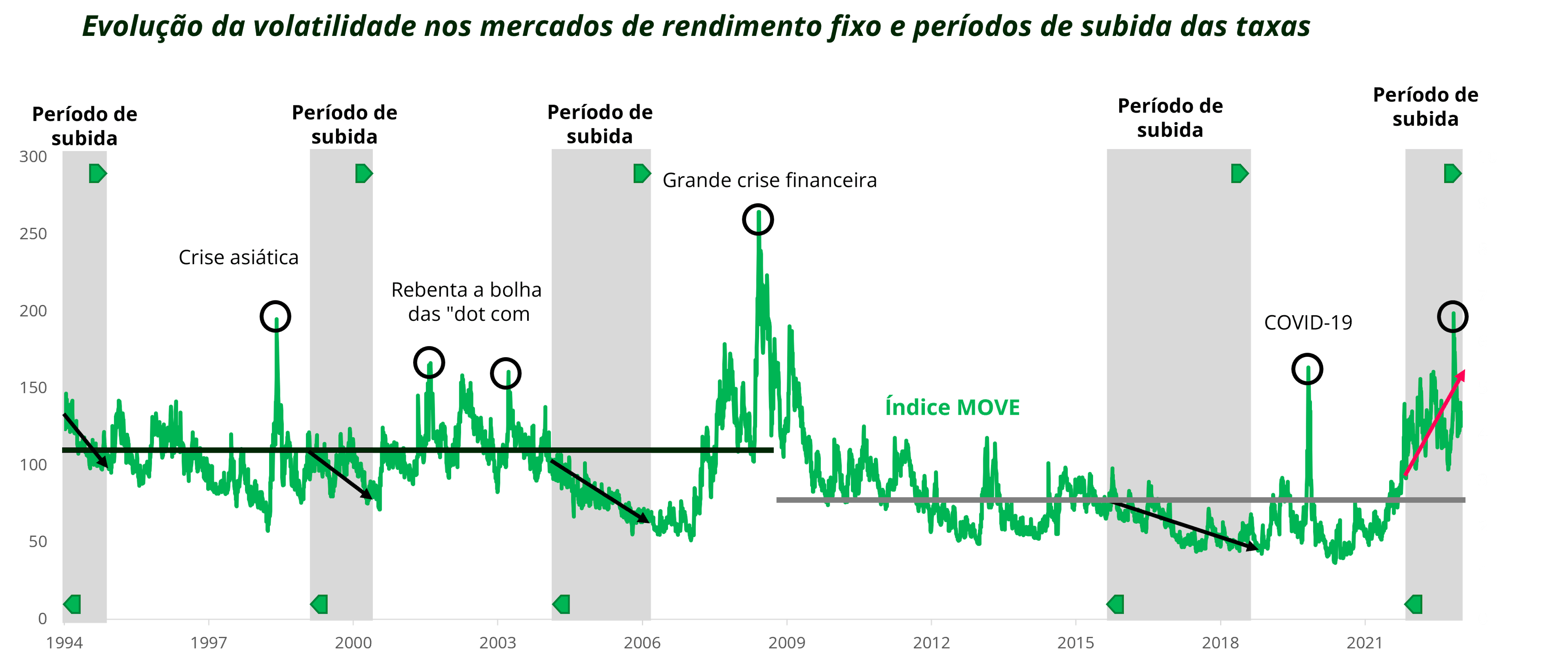 A volatilidade das taxas norte-americanas foi particularmente elevada nos últimos 12 meses. O índice MOVE tem estado próximo dos níveis associados a períodos de crise históricos (a Crise Asiática, o rebentamento da bolha da Internet, a Grande Crise Financeira de 2008, a Covid – ver os círculos negros no gráfico).